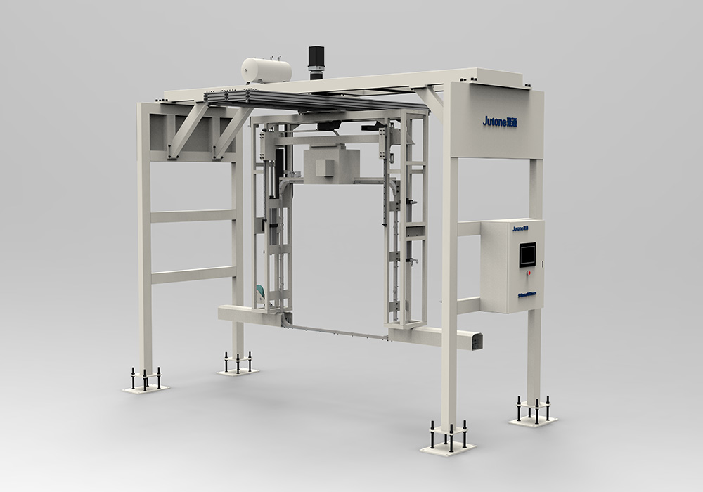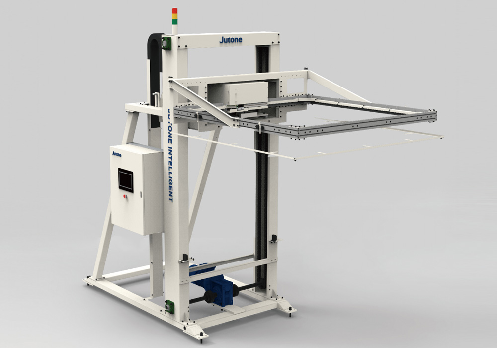This product is a pallet-free packaging line. It uses a combination of rotating clamps and brick-pulling clamps to stack blocks, so that each stack of blocks has a forklift fork-taking hole. The pallet-free packaging machine is then used to vertically bundle the blocks in the longitudinal and transverse directions, realizing the pallet-free transportation of blocks.